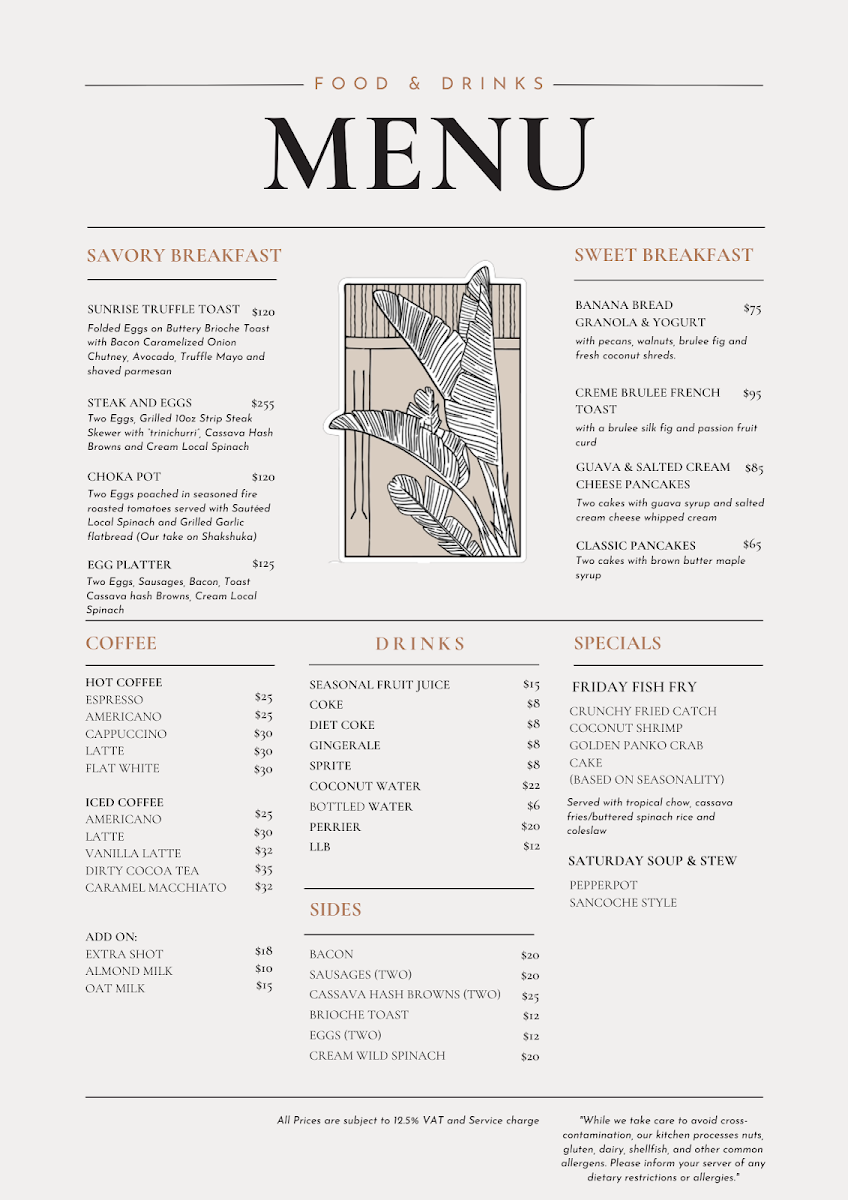 - Drinks – A selection of beverages likely encompassing coffee, juices, and other specialty drinks.